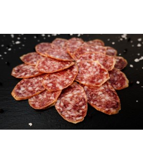 Se obtiene de la mezcla de las carnes picadas de cerdo criado respetando los requisitos de la Denominación de origen, Jamón de Teruel. Se elabora mediante un proceso de desecación y maduración que le asegura el mejor sabor, color y forma tan característicos.